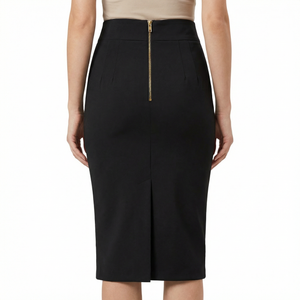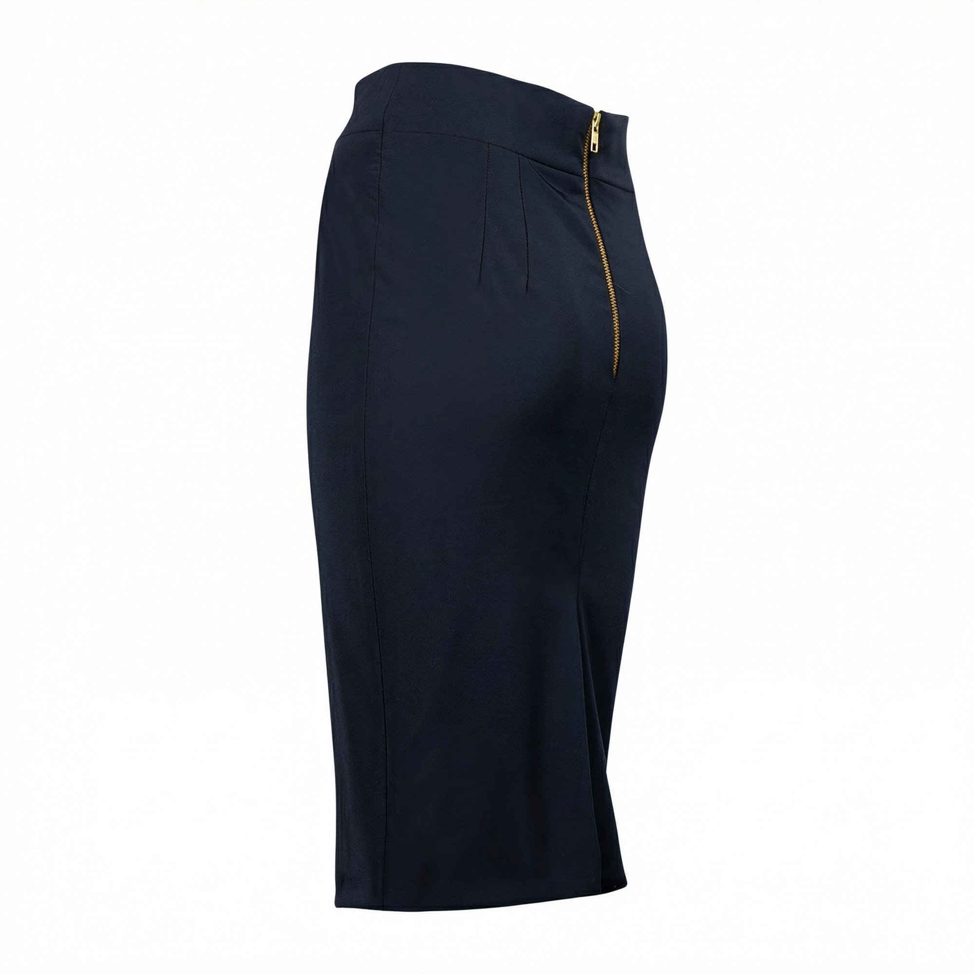 Two front darts and two back darts shape the skirt without pulling, while a concealed back kick pleat allows for comfortable movement.