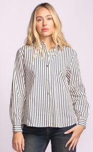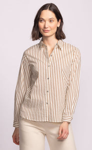 Choose it in camel stripe or any of your favorite neutrals—it’s the kind of timeless shirt that anchors a wardrobe and always feels right.