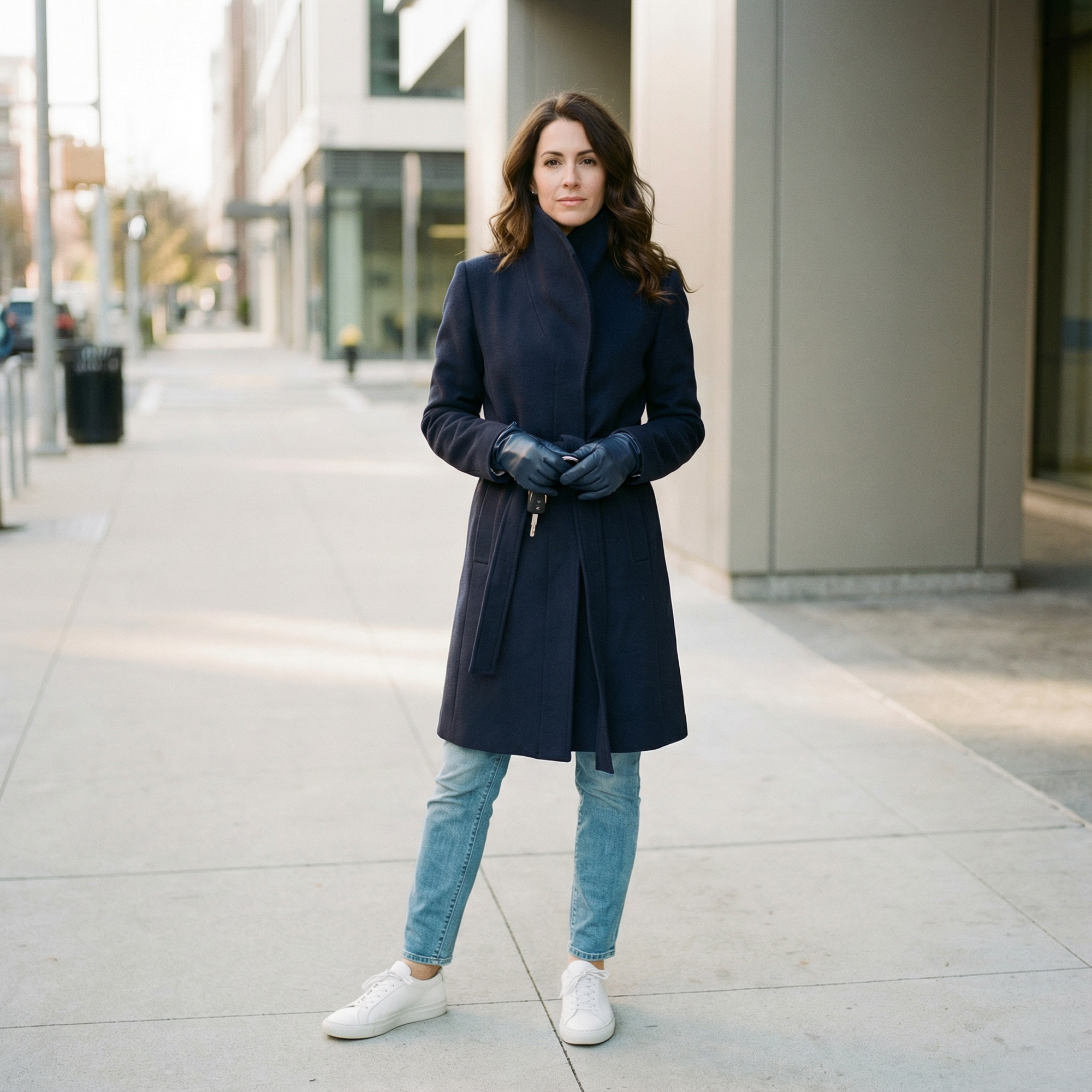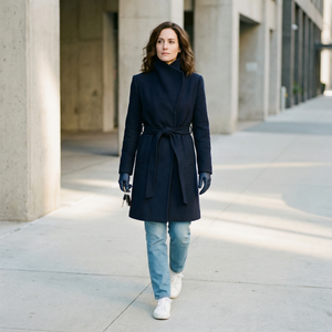 Wool–cashmere wrap coat is defined by its architectural funnel neck—a high, stand-up collar that widens subtly at the top, creating a clean, sculptural line while offering natural protection from wind and cold.
