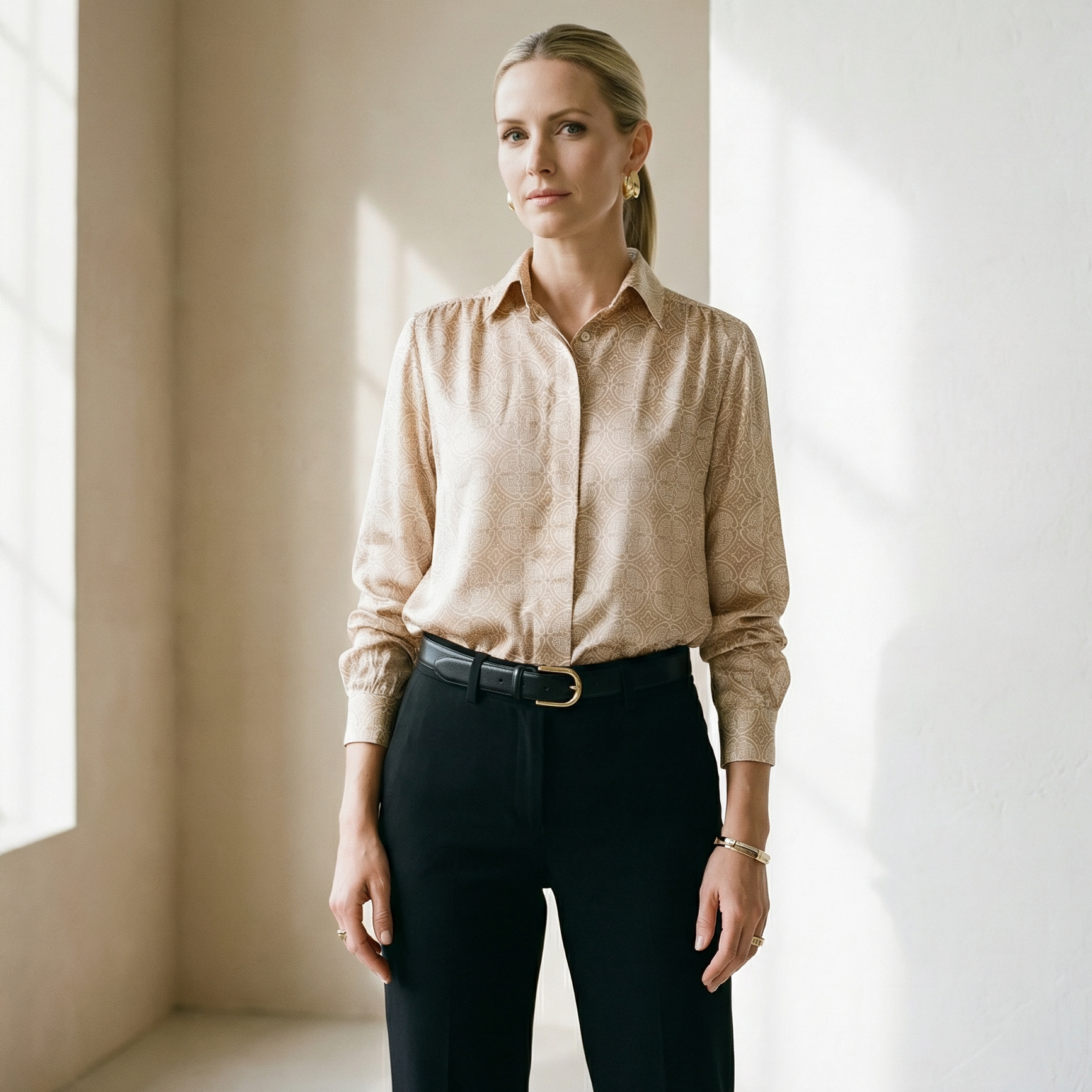 For the woman who builds her look with precision. L’Architecte features a modern geometric motif, evoking structure and edge with a soft, sculptural silhouette. The gathered sleeve adds architectural volume, while the hidden button placket preserves a clean, uninterrupted line. A collector’s piece — fewer than six made.