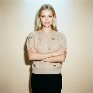A soft statement for winter days. The Alva Sweater is a cozy knitted short-sleeve style, designed with a flattering raglan cut and crafted from a super-soft yarn blend. Delicate all-over floral embroidery adds a gentle, feminine touch, making it the perfect match for skirts or tailored trousers. Ideal for those crisp winter moments when you want to feel both graceful and relaxed — a true treat to pull out and wear just for the joy of it.