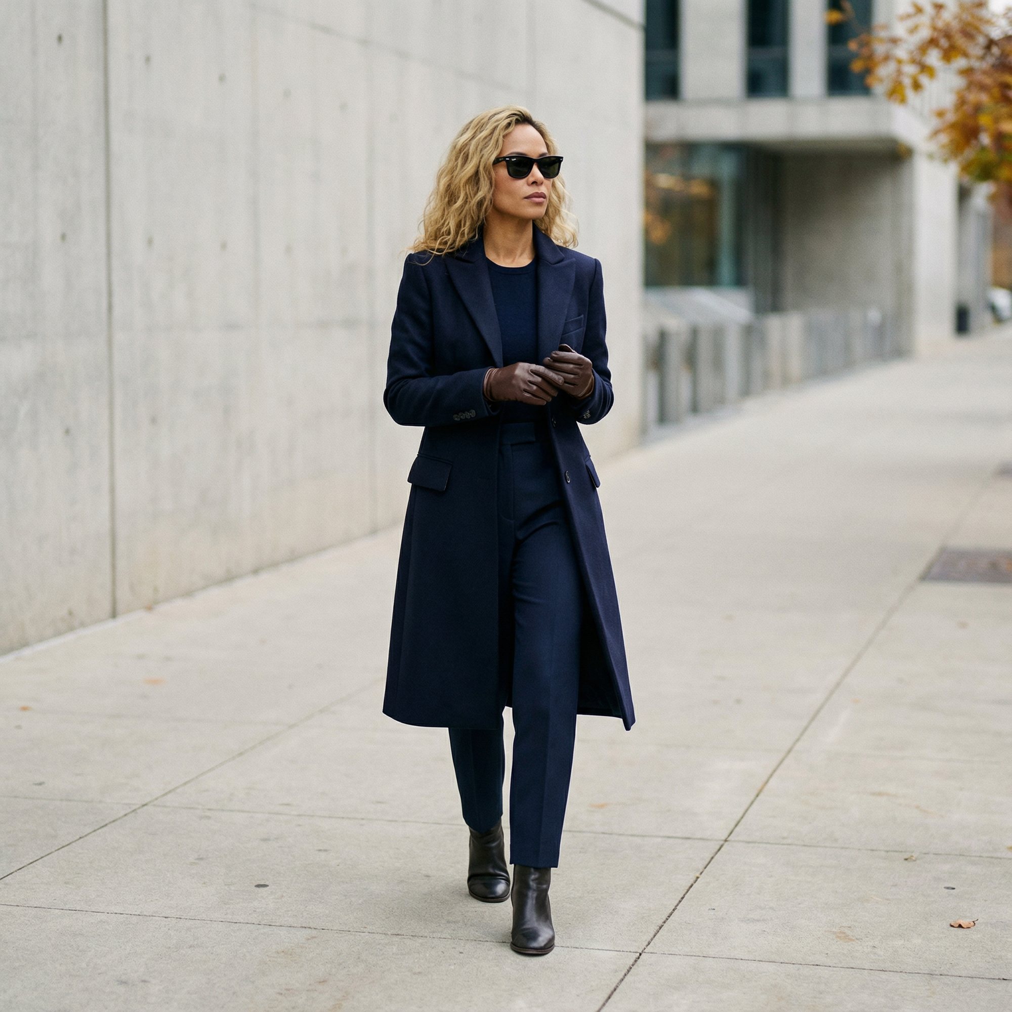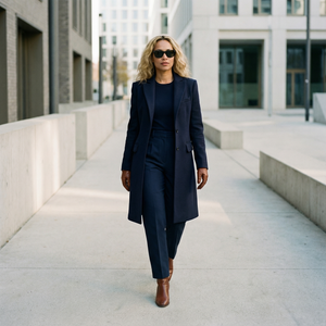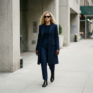 Inspired by classic riding coats, this mid-length silhouette brings structure, sharp lines, and ease into one refined layer. Cut from durable French navy wool remnants with a subtle silk-cotton blend, it’s a coat designed to hold its shape, weather wear, and elevate everything beneath it. The fit is intentionally streamlined—strong shoulders, a clean front, and a balanced length that suits both men and women.