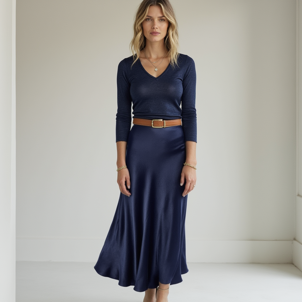 This timeless satin bias-cut midi skirt offers a beautifully fluid silhouette that drapes effortlessly, making it a versatile addition to your wardrobe. Designed for endless wear, its sleek finish and flattering cut can easily be dressed up or down for various occasions.